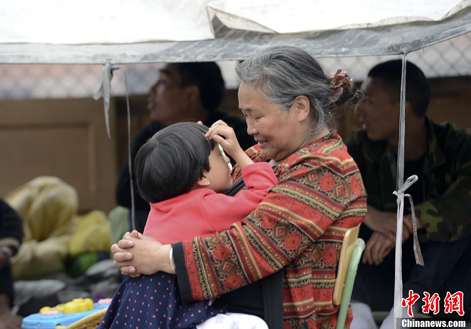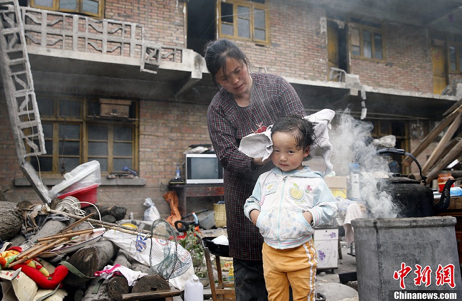 4月21日下午2點,吃完飯后傅玉潤的孫女在給媽媽挑白頭發。從4月20日地震發生以來,傅玉潤家都是吃的方便面和餅干,今天利用自家地里的菜和受損房間里的米做了一餐飯菜。中新社發張元 攝
