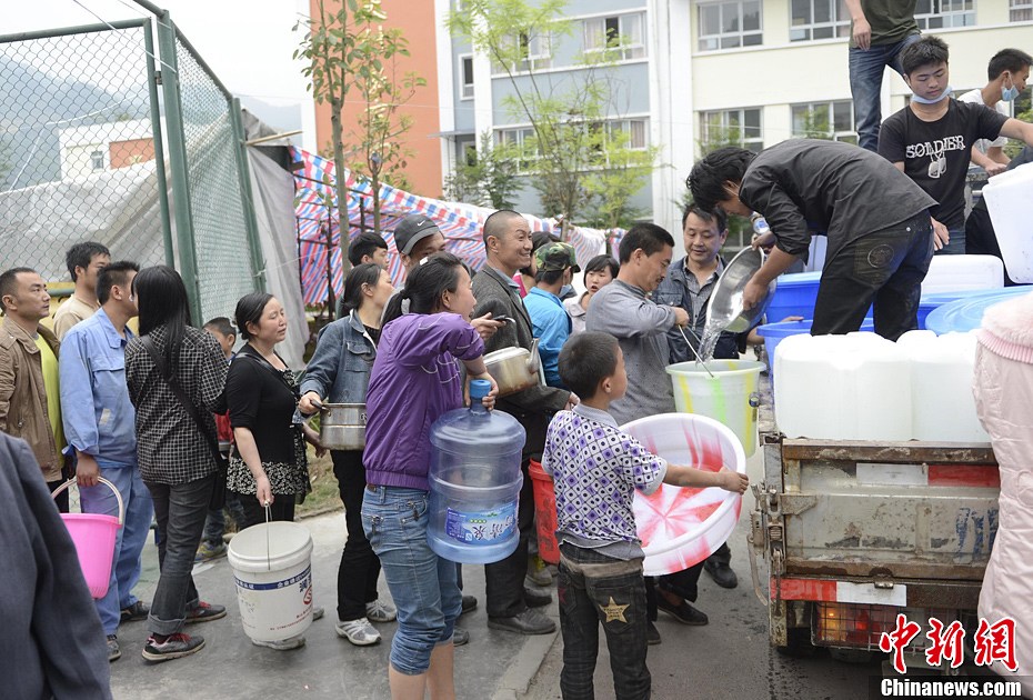 4月21日,四川省雅安市寶興縣靈關鎮靈關中學災民安置,志愿者為災民送水。中新社發 廖攀 攝