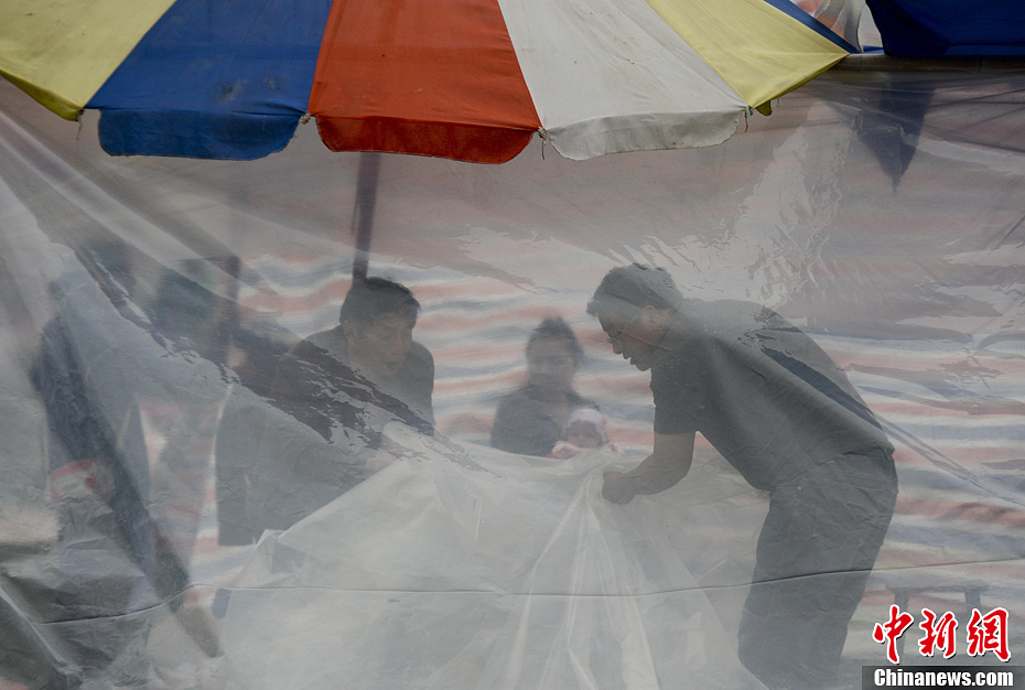 4月21日,四川省雅安市寶興縣靈關鎮,靈關中學安置點災民用塑料薄膜搭建抗震房。中新社發 廖攀 攝