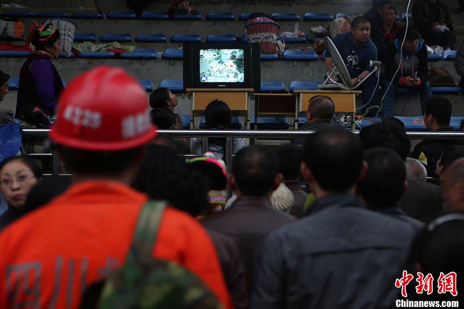 21日晚7時許,寶興縣中學災民安置點內,災民們正在觀看央視《新聞聯播》有關雅安地震的報道。許云峰 攝