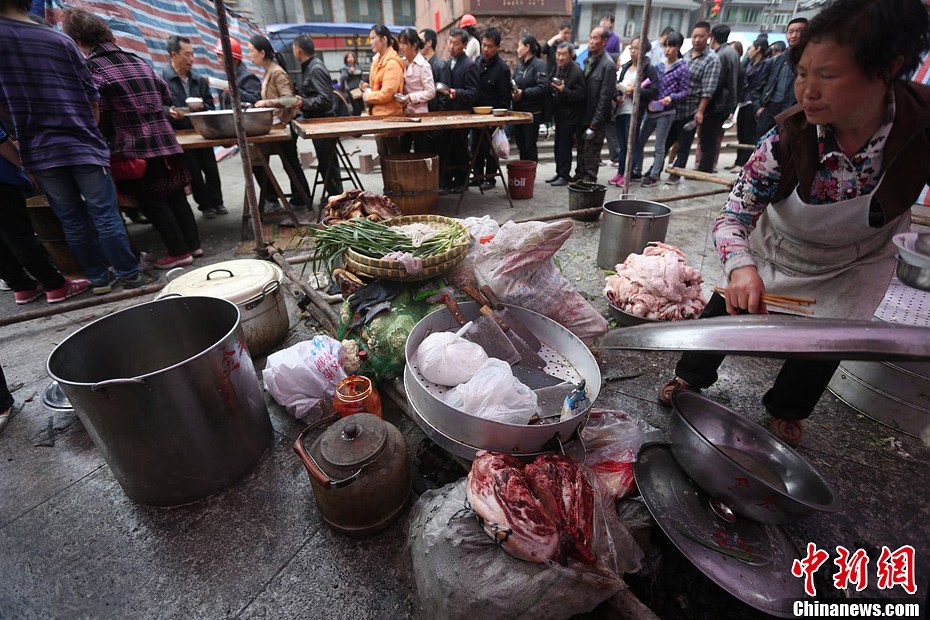 4月21日,四川省雅安市寶興縣靈關鎮,安置在靈關中學的居民動用自家老臘肉做飯。廖攀 攝