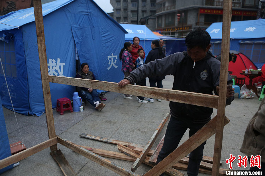 4月21日,四川省雅安市寶興縣靈關鎮,安置在靈關中學的居民搭建抗震房。廖攀 攝