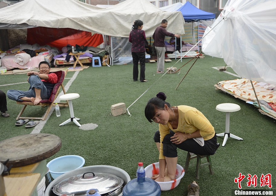 4月21日,四川省雅安市寶興縣靈關鎮,靈關中學內的避難災民在泡腳。廖攀 攝