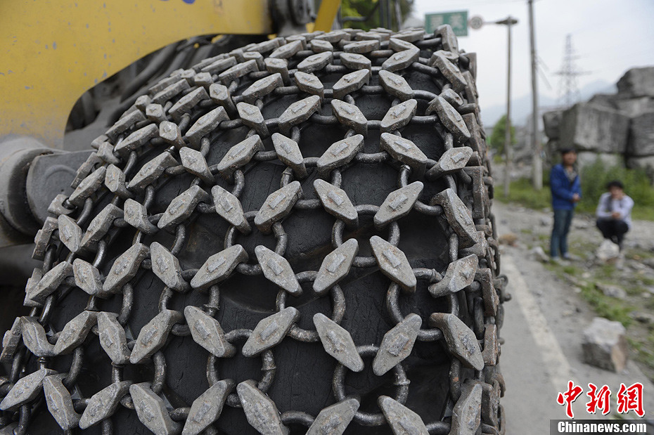 4月21日,四川省雅安市寶興縣靈關鎮施工車輛輪胎穿上了鐵鏈。廖攀攝