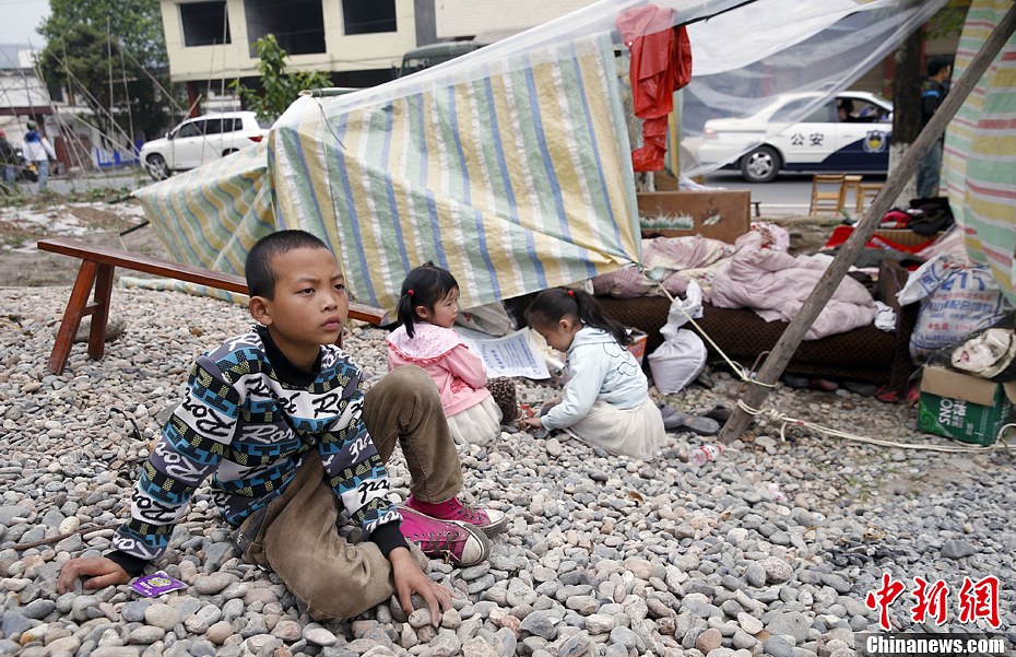 4月21日,四川雅安地震重災區蘆山龍門鄉,三位留守兒童在震后住進了簡易棚中,其中一個孩子一邊玩著鵝卵石一邊看著救援隊員在搬運物資。在雅安遭受地震災害的許多村子里,許多父母都外出打工,留下了年邁的長輩和幼小的孩子。中新社發張浩 攝