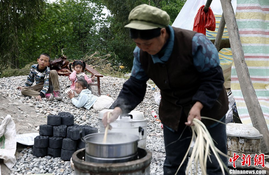 4月21日,四川雅安地震重災區蘆山龍門鄉,三位留守兒童在震后住進了簡易棚中,他們的老奶奶則在為他們做飯。在雅安遭受地震災害的許多村子里,許多父母都外出打工,留下了年邁的長輩和幼小的孩子。中新社發張浩 攝