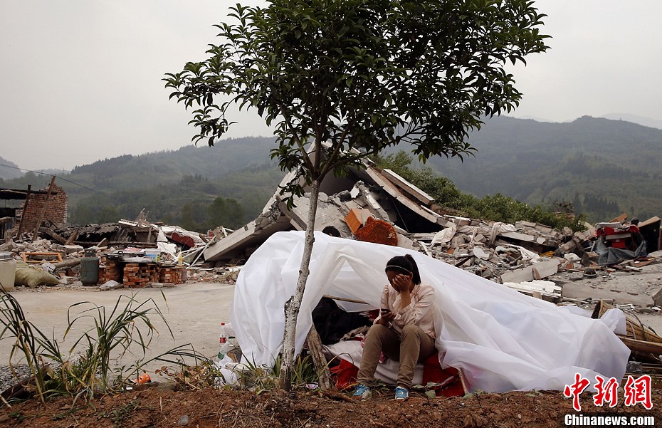 4月21日,四川雅安地震重災區蘆山龍門鄉,一名女學生坐在自制的抗震棚里,后面是已成廢墟的“家”,她20日剛從學校趕回來,得到的是家破人亡的噩耗。中新社發張浩 攝