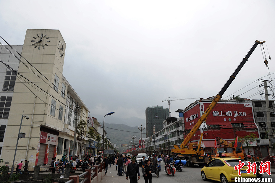 4月21日,四川雅安市蘆山縣城里塔吊正對倒塌的電線桿實施搶險救援,左面商業樓的時鐘定格在8時2分。據四川省民政廳4月21日17時統計,四川雅安、成都、眉山、自貢、德陽、綿陽、樂山、遂寧、南充、宜賓、內江、達州、廣安、資陽、甘孜、阿壩和涼山17個市州104個縣150余萬人因震受災,184人死亡。中新社發陳超 攝