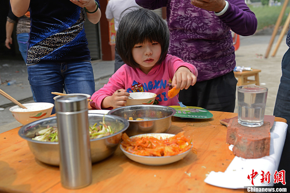 4月21日下午2點,蘆山縣龍門鄉75歲的村民傅玉潤(右一),地震以來第一次吃上了大米飯。從4月20日地震發生時傅玉潤被掉落的磚塊砸傷頭部,現已無大礙。中新社發張元 攝