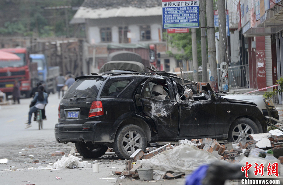4月21日,四川省雅安市寶興縣靈關鎮,街頭的受損車輛。中新社發廖攀 攝
