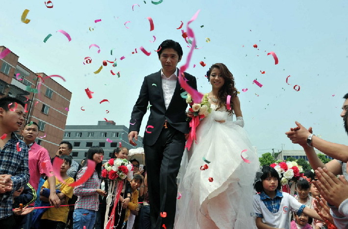 4月21日,盡管余震不斷,滎經(jīng)縣城一對新人如期舉行了婚禮。“4·20”蘆山地震給當(dāng)?shù)鼐用竦纳钤斐珊艽笃茐模跅l件簡陋的臨時居所里,生活依然在繼續(xù)。新華社記者楊楹 攝
