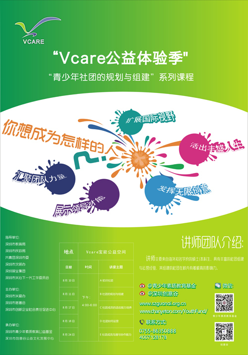 7月?20日啟動的V-care暑期公益體驗季系列活動已開展了愛心涂鴨、航天科普、手工拼豆、音樂、陶笛、DIY、舊物改造、留學生沙龍等數(shù)十場公益活動。在此基礎上,本周末開始,新增“青少年社團的規(guī)劃與組建”系列課程和以在校學生為對象的公益教育大講堂,向市民免費開放。