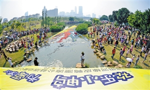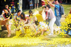 ????【深圳商報(bào)訊】(記者 管亞?wèn)| 通訊員 馮曉)昨天,“歡樂(lè)小鴨為愛(ài)漂流”2013深圳福田河橡皮鴨漂流公益活動(dòng)愛(ài)心見(jiàn)證儀式在深圳中心公園盛大舉辦,50000只橡皮小鴨向市民發(fā)出愛(ài)的邀約,近千名市民參加了現(xiàn)場(chǎng)活動(dòng)。