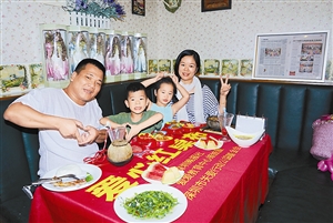 ▲潘權一家在娃娃屋“愛心紅桌布”餐桌就餐。 深圳晚報特約記者 韋建誠 攝