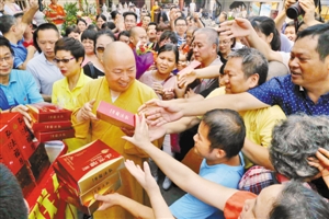 昨天,印順大和尚在弘法寺為市民發放月餅,送上祝福。通訊員 張輝 攝