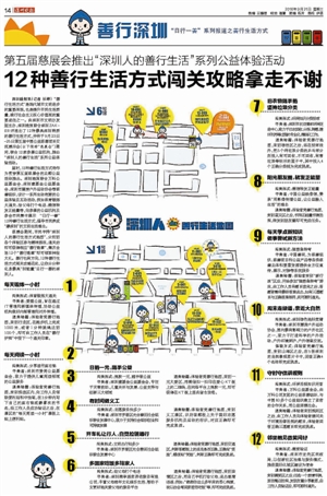 本次此展會中,深圳市文明辦聯合深圳晚報,共同推出“深圳人的善行生活方式”互動體驗活動。主辦方將邀請最能代表這十二種生活方式的公益機構,在慈展會現場設置12個活動展臺,參加展會的市民可在慈展會服務臺領取善行生活方式通關地圖,前往體驗12個體驗區參與互動游戲,一次玩轉12種善行生活方式,集齊12枚通關印章前往活動兌獎區,可領取“小善君”公益禮包一份。