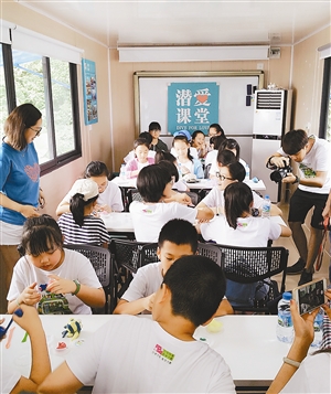 在潛愛手工坊,學員們可以用五顏六色的橡皮泥制作自己心中最美的海洋生物:藍鯨、魔鬼魚、珊瑚;觀珊瑚,近距離的看見水面之下的珊瑚寶寶長勢如何,普及了海洋救生知識和海洋豐富的物種;走沙灘,親眼觀察、觸摸到貝殼等生物,體驗鮮活的海洋生物保育知識,了解到人類與海洋是命運共同體。