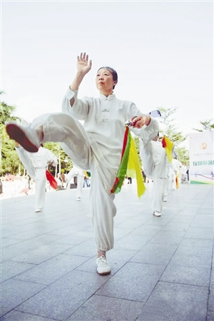 據了解,太極拳在深圳有著廣泛的群眾基礎,在福田體育公園服務站點,上至80歲的老人,下至十幾歲的小學生都在練習太極拳。深圳全市現在設有155個太極拳輔導站,每天堅持練習的市民達上萬人。當悠揚的音樂響起,來自深圳全市的八支代表隊、1300多名太極拳愛好者同時起勢,在綠樹的掩映下,展現了太極拳天人合一的獨特魅力。在各區代表隊單獨展演中,太極拳愛好者和專業教練們更是將24式太極拳、楊式太極拳、陳式太極拳、太極劍、太極刀、太極拂塵等功法表現得淋漓盡致。其中,太極劍連綿不斷、柔和圓滑,姿勢優美;太極刀剛勁有力、舒展大方;太極拳哼哈有力、架勢沉穩,得到觀眾們熱烈的掌聲。