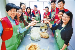 冬至當(dāng)日,平湖街道機(jī)關(guān)第一黨支部全體黨員前往街道老年人日間照料中心和職業(yè)康復(fù)中心,為老人和殘疾人包餃子,送上節(jié)日的問候。平湖街道黨工委副書記邵凱洋、組織部長林堅(jiān)、婦聯(lián)主席謝瓊蓮也參與其中。現(xiàn)場,黨員們分工協(xié)作,緊張忙碌地和面、搟面、剁餡兒、煮餃子……在大家的共同努力下,1000多個餃子在一上午便順利完成。當(dāng)黨員們把熱騰騰的餃子送上老人和殘疾人的餐桌上時,老人和殘疾人紛紛稱贊餃子好吃,并對黨員們的探望表示感謝。一位老人表示,自從來到日間照料中心,她便總是被大家濃濃的關(guān)懷所包圍,不止是逢年過節(jié),平日里也常常有年輕的黨員、義工和愛心人士前來探望。“老人們其實(shí)很容易滿足,經(jīng)常有人陪陪他們,就會高興得合不攏嘴。”經(jīng)常參加慰問活動的黨員李女士表示,這樣的活動參加多了,便會在不知不覺中懂得父母、長輩們需要什么,漸漸學(xué)會如何感恩。