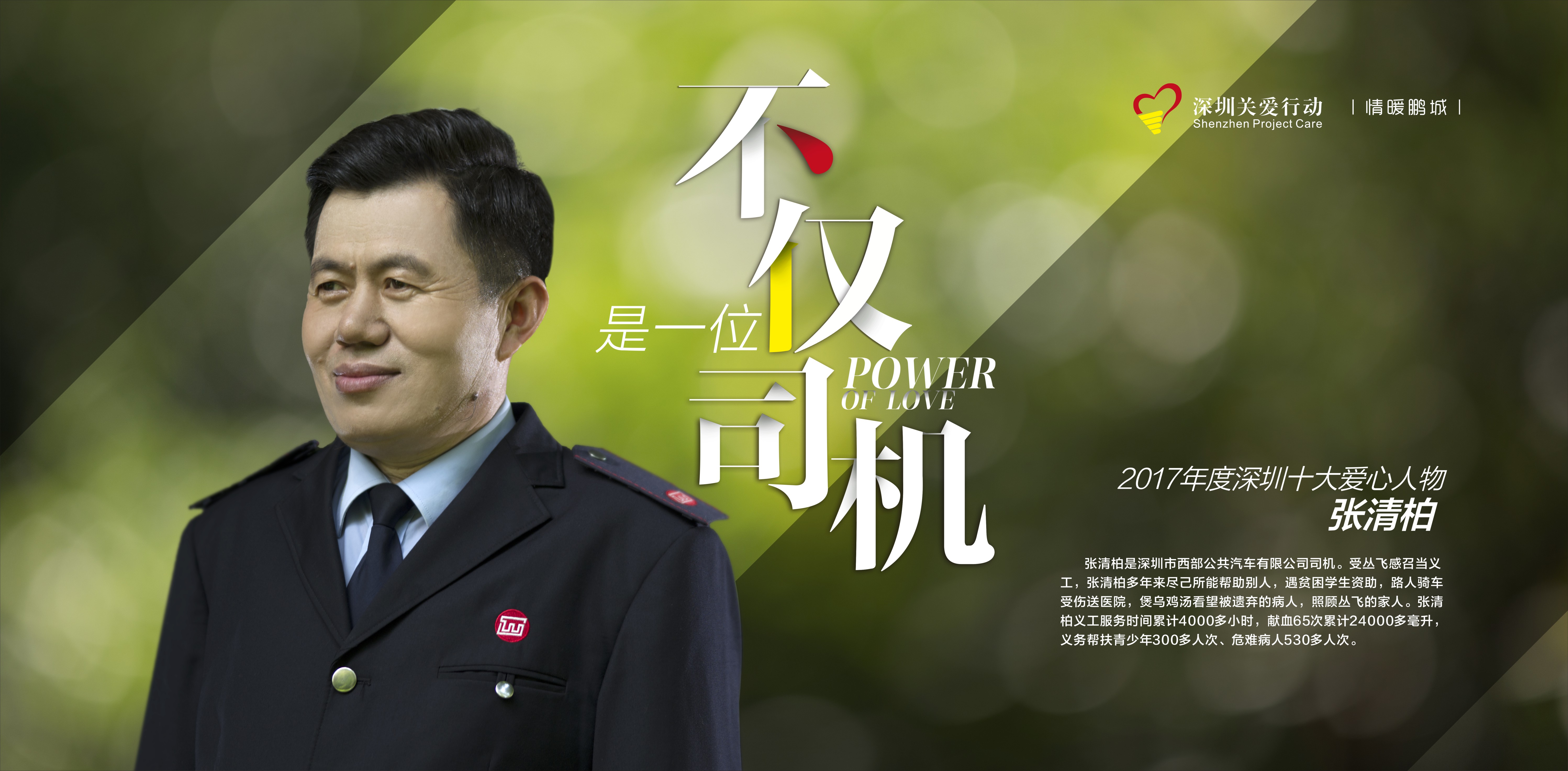 男,深圳市西部公共汽車有限公司駕駛員。2006年,張清柏受叢飛感召當義工,多年來耗盡積蓄助人:偶遇貧困學生,他積極資助;路人騎車受傷,他毫不猶豫送往醫院,捐款又陪伴;被遺棄的病人無人照料,他煲烏雞湯、買水果看望并捐款;叢飛去世后他主動照顧叢飛家人,展示了樸實的人間真情,叢飛的父親對張清柏贊不絕口,稱他早就是自己的“親兒子”。張清柏義工服務時間累計4000多小時,累計獻血65次達24000多毫升,義務幫扶青少年300多人次、危難病人530多人次。他是深圳松崗首屆十佳技術能手、深圳西部公汽十佳親善大使、西部公汽第二屆最美公交人、深圳義工聯合會五星級義工、全國無償獻血金獎獲得者。2014年,當選中國第四屆最美職業工作者。