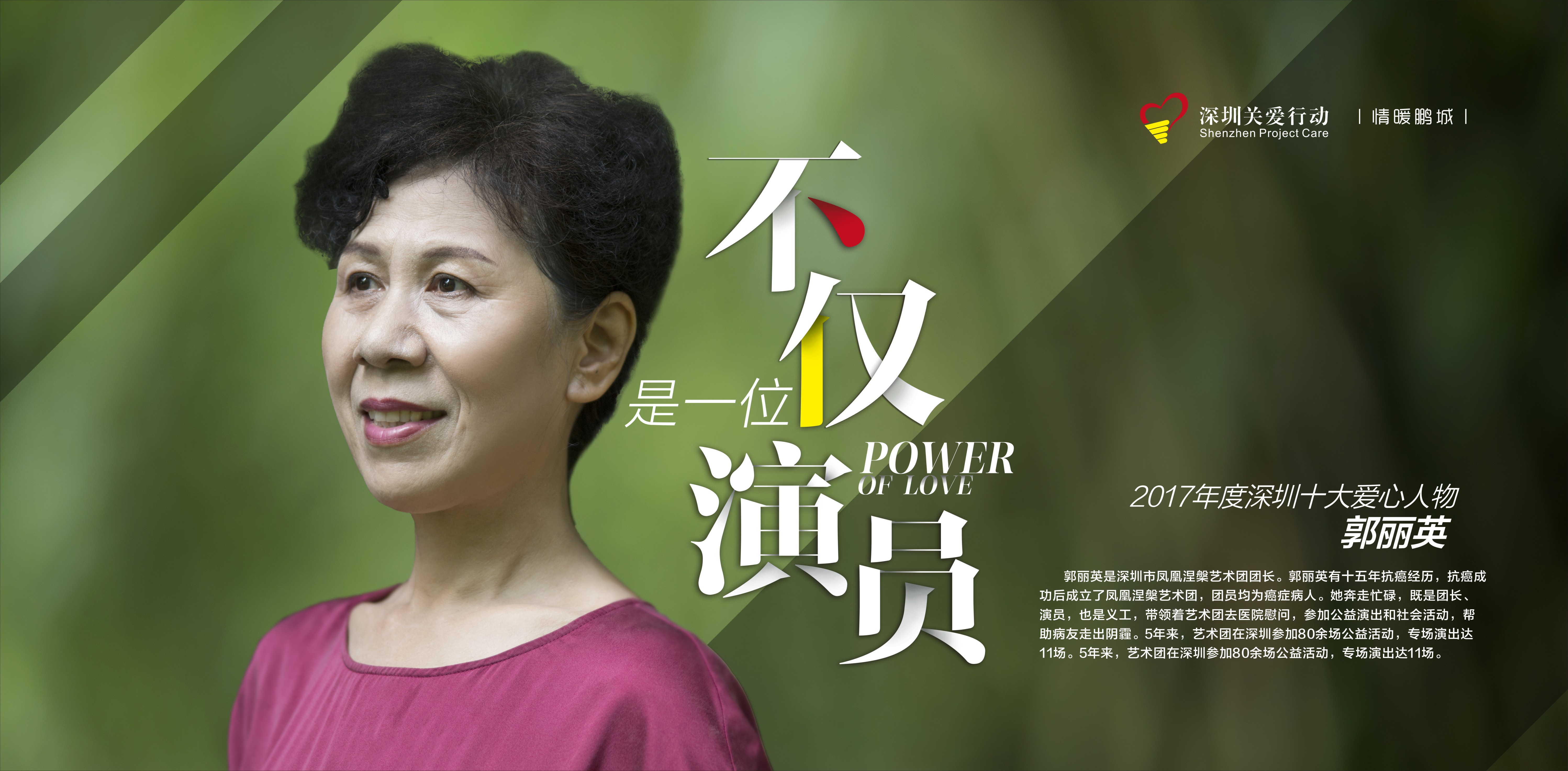 女,深圳市鳳凰涅槃藝術團團長。郭麗英有十五年抗癌經歷,2002年抗癌成功后,在叢飛的鼓勵下,她成立了鳳凰涅槃藝術團,創辦了一個由一百多名癌癥病人組成的特殊藝術團。她拾起了自己的小提琴,走上舞臺,鼓勵癌友抗癌,重新用藝術點亮生命。為了給新老病友帶來快樂,警示世人珍惜生命,她奔走忙碌,既是團長、演員還是義工,帶領藝術團將各種真實故事以藝術形式演繹,通過去醫院慰問、參加公益演出和社會活動,幫助病友走出陰霾,足跡遍布全國的大江南北。藝術團成立近5年來,在深圳參加80余場次各類社會公益活動,專場演出已達11場。她本人也被授予全國“十大巾幗”、騰訊《共鳴》年度人物等多項榮譽稱號。