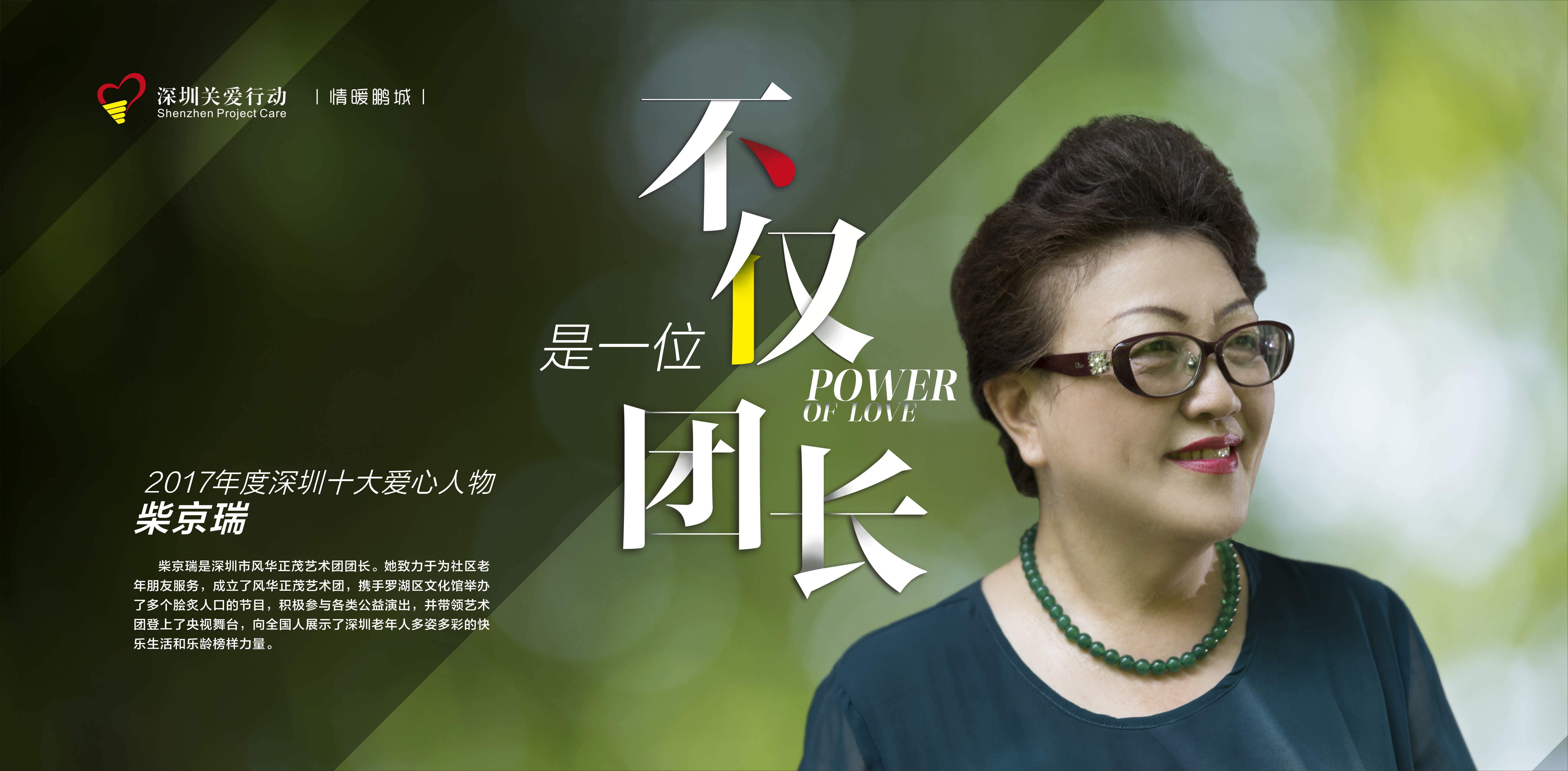 女,深圳市風(fēng)華正茂藝術(shù)團(tuán)團(tuán)長。在深圳羅湖成立了中老年藝術(shù)團(tuán)——風(fēng)華正茂藝術(shù)團(tuán),致力于為社區(qū)老年朋友服務(wù),堅持貼近大眾,與民同樂,注重原創(chuàng),推陳出新、打造特色、打磨精品。與羅湖區(qū)文化館09劇場共創(chuàng)《軍哥劇說系列之劇說快樂》、編創(chuàng)的小品《牽手》、表演唱《童心童趣》等節(jié)目是深受各年齡段觀眾歡迎的保留節(jié)目,每逢上演,座無虛席,展現(xiàn)了老年人的健康心態(tài)和精神風(fēng)貌。其中,《牽手》獲得全國《中華頌》小品小戲曲藝大展銀獎。她還積極參與各類公益演出。2015 年,她擔(dān)任深圳娛樂生活頻道中老年電視大賽《深圳老有才了》欄目評委,并通過該節(jié)目組推薦,帶領(lǐng)藝術(shù)團(tuán)的老演員們登上了央視《星光大道》舞臺,連闖三關(guān),向全國人民展示了深圳老年人多姿多彩的快樂生活和樂齡榜樣力量。