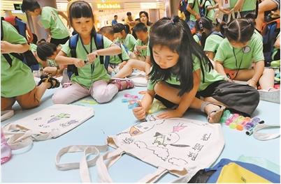 昨日,由寶安區沙井街道黨工委、辦事處主辦的“蠔鄉暖童心,因愛相守護”留守兒童關愛月在沙井新沙天虹購物中心啟動。來自湖南、湖北、江西等省的300多位外來留守兒童“小候鳥”參加活動。圖為孩子們正在彩繪環保袋。