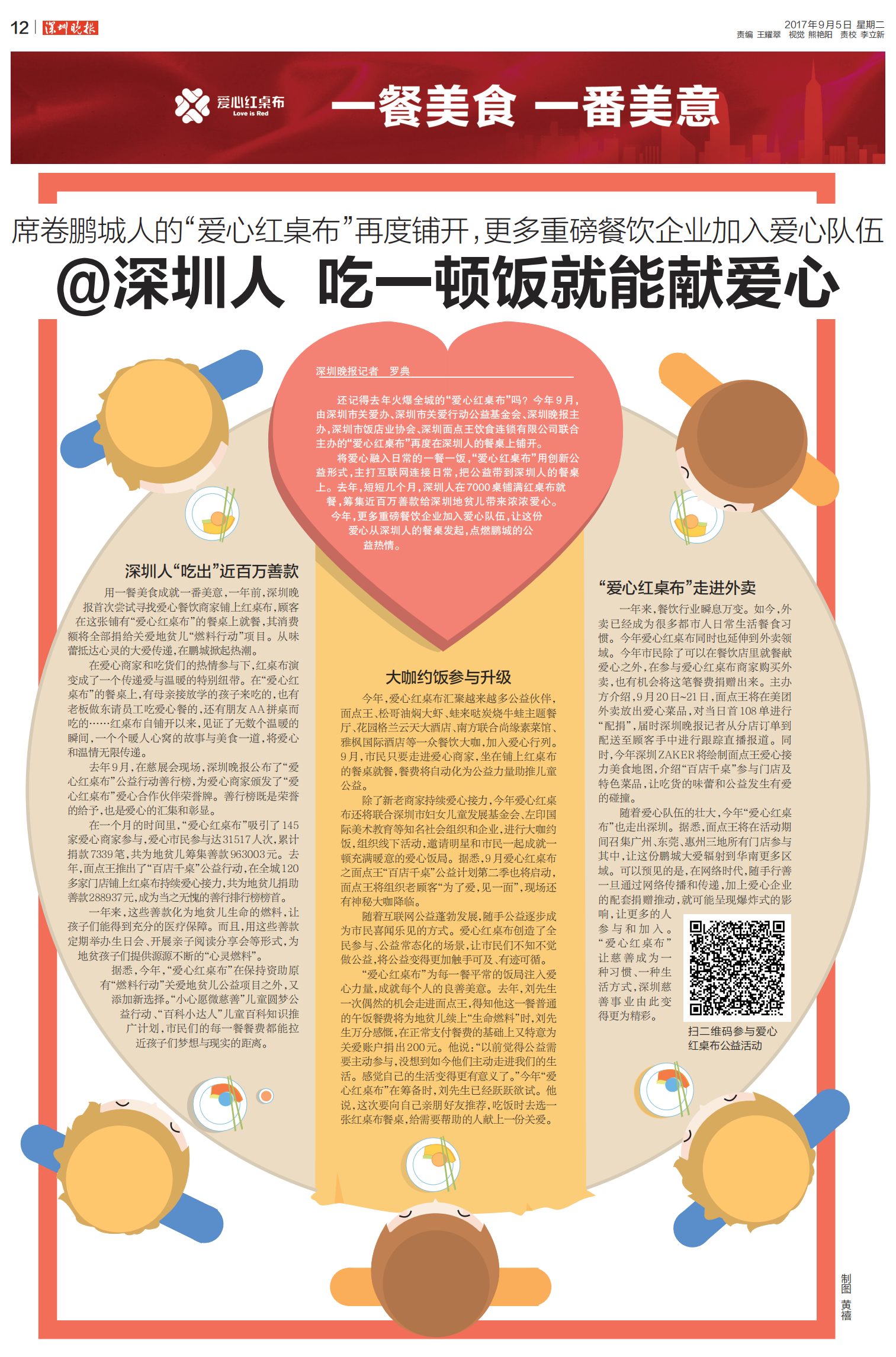 用一餐美食成就一番美意,一年前,深圳晚報首次嘗試尋找愛心餐飲商家鋪上紅桌布,顧客在這張鋪有“愛心紅桌布”的餐桌上就餐,其消費額將全部捐給關愛地貧兒“燃料行動”項目。從味蕾抵達心靈的大愛傳遞,在鵬城掀起熱潮。