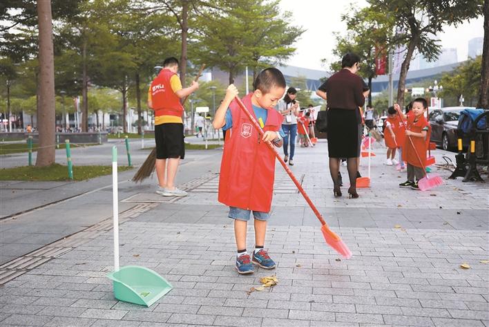 清晨5點多,晨曦微露,百余位熱心的小志愿者就陸續(xù)來到了福田區(qū)、羅湖區(qū)、南山區(qū)的活動現(xiàn)場。他們?nèi)齼沙山M,分工明確,有的負(fù)責(zé)清掃,有的負(fù)責(zé)清運。在中心書城活動現(xiàn)場,一位小志愿者用夾子將花池邊的煙頭一個個夾進(jìn)垃圾袋;一位小男孩細(xì)心地用手將嵌進(jìn)地磚縫的牙簽、果殼摳出。5歲男孩冀泓琿拿著比自己還高的掃帚,在爸爸的指導(dǎo)下將落葉掃進(jìn)簸箕;7歲的玄梓涵麻利地清掃著垃圾,不一會兒就把媽媽落在了后面。活動從5點持續(xù)到7點半,幾條路清掃下來,小志愿者們額頭上冒出了汗珠,汗水濕透了衣衫。