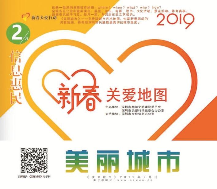 1月28日,由深圳市關愛辦聯合市文體旅游局推出的“2019新春關愛地圖”正式推出。該項目作為2019新春關愛行動文化福利板塊的重點項目,已連續推出兩年。今年,新春關愛地圖再次帶著全市百余項適合市民參與的活動資訊而來,不僅有新春關愛行動七大板塊“感恩慰問”“溫暖回家”“在深過年”“文化福利”“網絡公益”“精準扶貧”“志愿服務”的重點關愛活動,還有大量文化、旅游、電影、講座、展覽等資訊。
