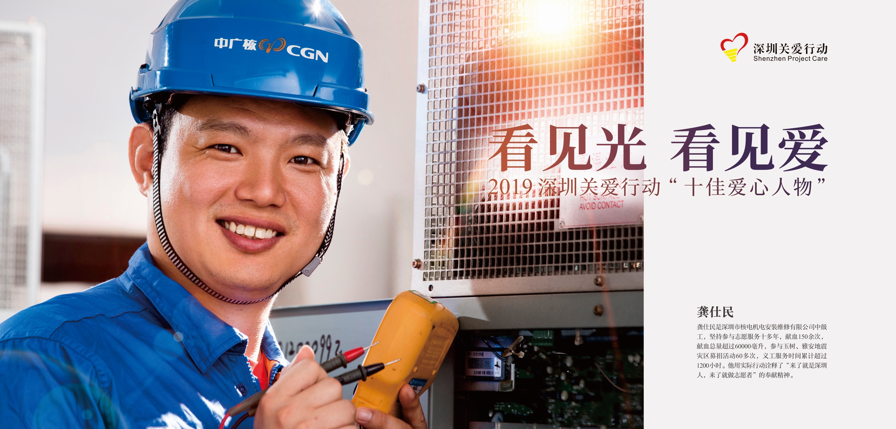 男,深圳市核電機電安裝維修有限公司中級工。作為一名來深務工人員,他求知若渴,憑著一股不服輸的韌勁,通過自學考試完成了從初中畢業到大學本科的蛻變,實現了扎根深圳的夢想。在圓夢過程中,他得到很多好心人的幫助,他心懷感恩,以參與志愿服務的方式回報社會。十多年來,龔仕民獻血150余次,獻血總量超過60000毫升,義工服務時間累計超過1200小時,還堅持參加獻愛心活動、環保志愿者活動,長期服務于各種公益活動,其中參與玉樹、雅安地震災區募捐活動 60多次。他用實際行動詮釋了“來了就是深圳人,來了就做志愿者”的奉獻精神。2018年10月4日, CCTV新聞頻道“曬曬我家的獎章獎狀”欄目對他十幾年來的獻血事跡作了報道。