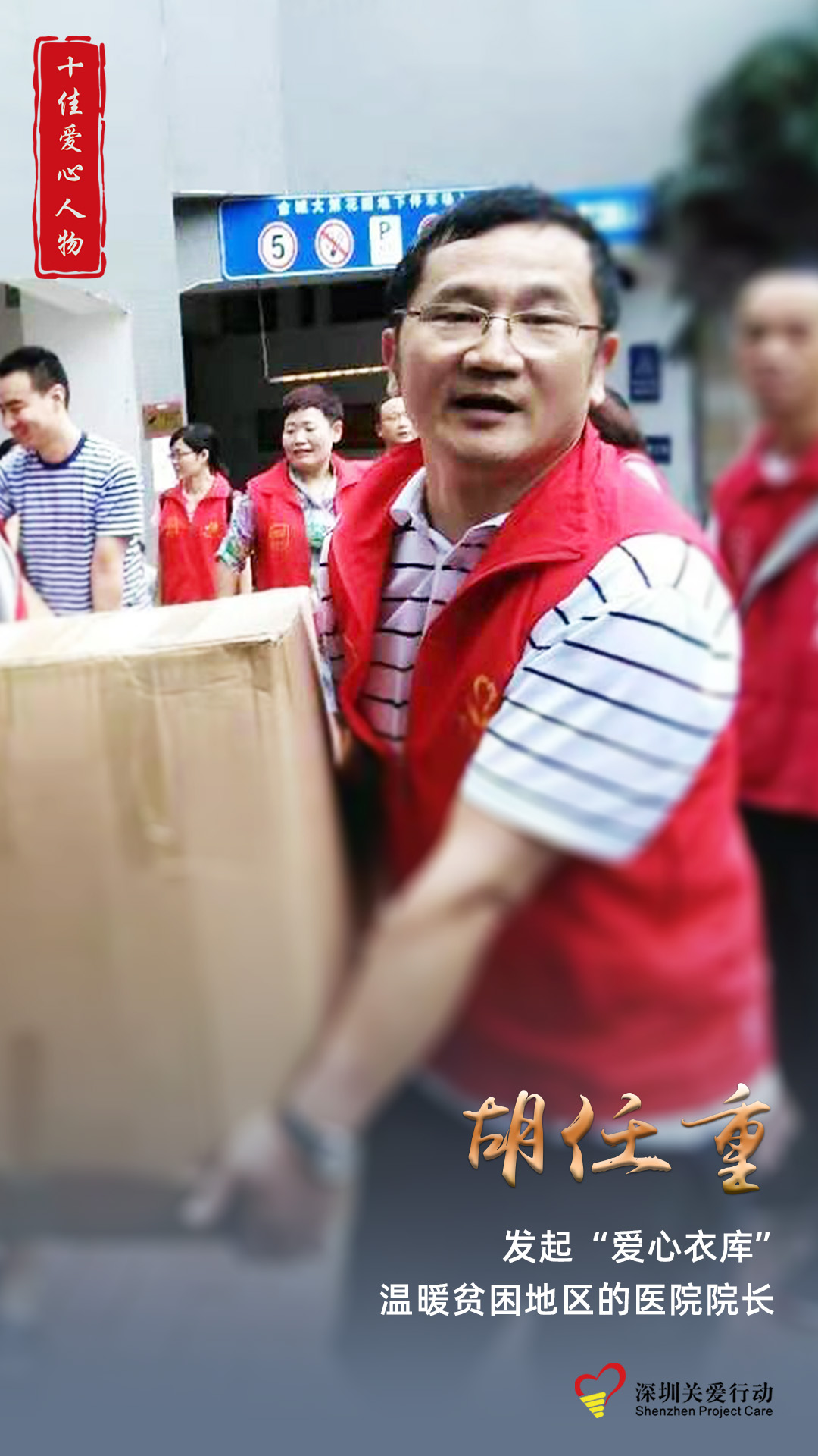 胡任重,深圳市光明區(qū)婦幼保健院副院長。從2008年至今,每年“全國助殘日”,組織深圳獅子會、企業(yè)家為光明職康中心殘疾人購買殘疾人手工藝品,共計40余萬元。從2013年至今,每年組織義診專家團隊到廣東陸河、深圳大鵬及光明各社區(qū)為環(huán)衛(wèi)工人等進行義診,總計1000余次。2014年成立“光明區(qū)愛心扶貧一幫一助學公益群”,已累計資助了102名貧困學生,其中胡任重一家資助了13名貧困學生。2013年發(fā)起成立農工黨光明直屬支部“愛心衣庫”,每年向邊遠地區(qū)進行捐贈活動,先后籌措40萬元采購了220箱御寒衣服和4箱圖書文具,分別送給青海、四川、西藏等地的老人院、孤兒院和貧困地區(qū)。