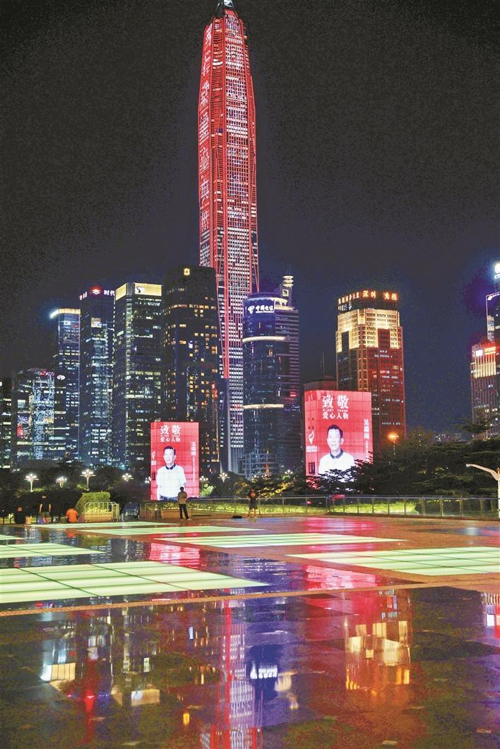 夜幕降臨,華燈初上,市民中心南廣場兩側," 十佳愛心人物 " 公益海報點亮六座水晶塔。站在平地,可以遠眺見平安金融中心大廈等福田樓宇為愛 " 刷屏 ",過路市民對此紛紛駐足點贊。