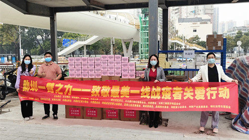 深圳市關(guān)愛行動公益基金會迅速行動,聯(lián)合公益伙伴、愛心企業(yè)迅速籌集關(guān)愛物資。本來生活網(wǎng)捐贈一批食品、飲料和飲用水。深圳市潮汕商會聯(lián)合廣州泓景堂醫(yī)藥有限公司捐贈了800箱金銀花保健涼茶。關(guān)愛基金會·粉紅絲帶關(guān)愛基金捐贈了2000瓶抑菌洗手液,關(guān)愛基金會·創(chuàng)新產(chǎn)業(yè)發(fā)展基金捐贈了食品和飲用水。這批關(guān)愛物資在深圳市職工解困濟難基金會和福田區(qū)總工會的支持下,迅速送達(dá)福田區(qū)福保街道,由街道工會負(fù)責(zé)安排志愿者為一線抗疫人員送去生活物資和健康關(guān)愛。