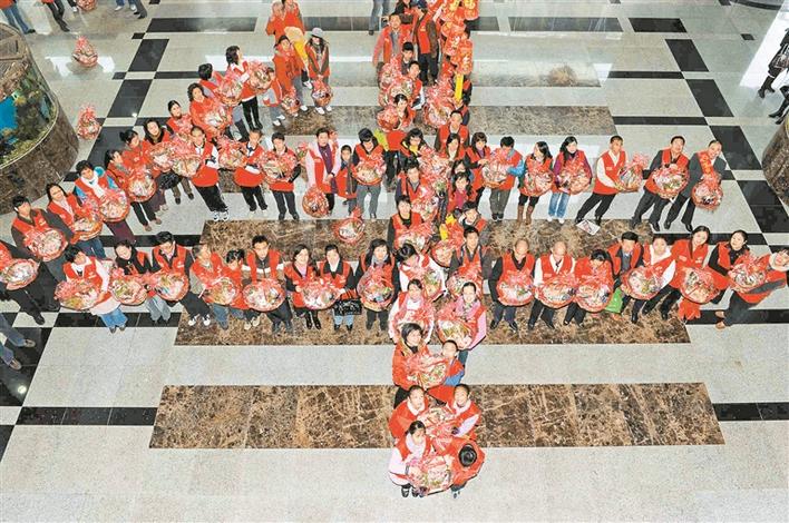 ▲2009年,愛心年夜飯出發(fā)儀式,志愿者擺出“牛”字造型。