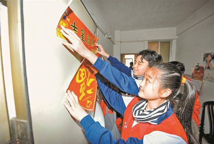 ▲參加愛心年夜飯活動的孩子們幫受助家庭貼春聯(lián)。