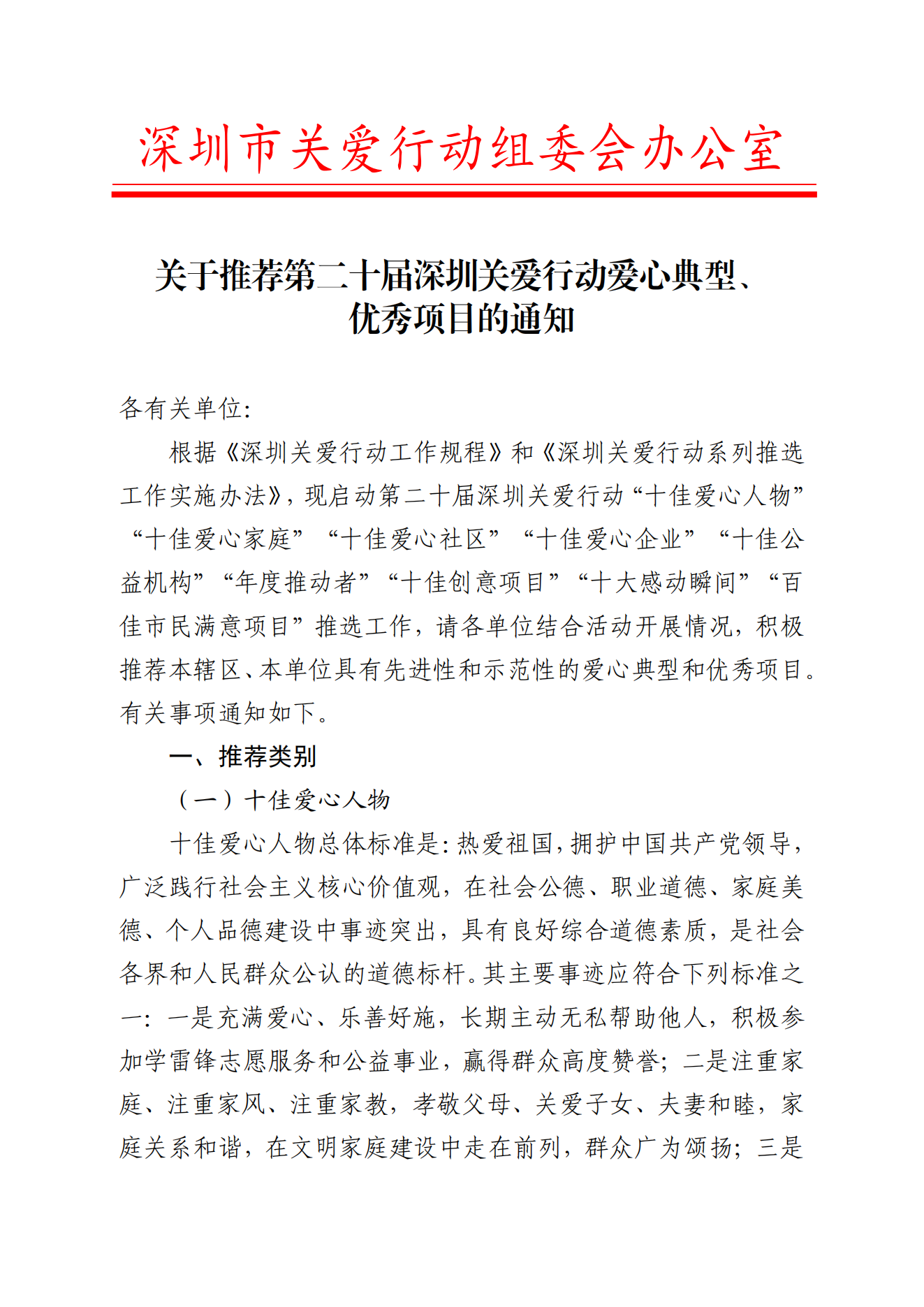 關于推薦第二十屆深圳關愛行動愛心典型、優秀項目的通知