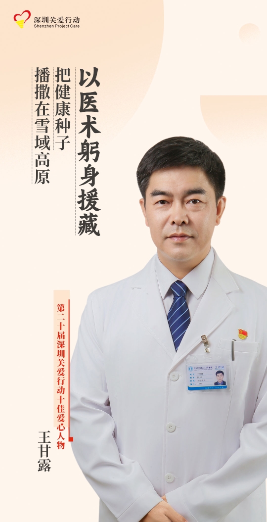 在2018年至2021年期間,王甘露主動請纓,并作為廣東省深圳市派駐西藏自治區林芝市察隅縣“三級醫院對口幫扶”的醫療專家,與團隊一起深入偏遠山村及邊防部隊巡回診療,推進緊密型縣域醫療共同體(以下簡稱“醫共體”)建設,不僅全方位提升了縣醫院、6個鄉鎮衛生院、96個村醫務室的整體醫療水平,培養出一批各類醫療與衛生人才;還搭建了智慧醫療與健康、遠程醫療和互聯網醫院等多個平臺。當地藏族老百姓親切稱呼他是“好門巴”(藏語“好醫生”),曾獲評“全國脫貧攻堅先進個人”、西藏自治區“全區優秀基層干部”、“廣東好人”等榮譽稱號。