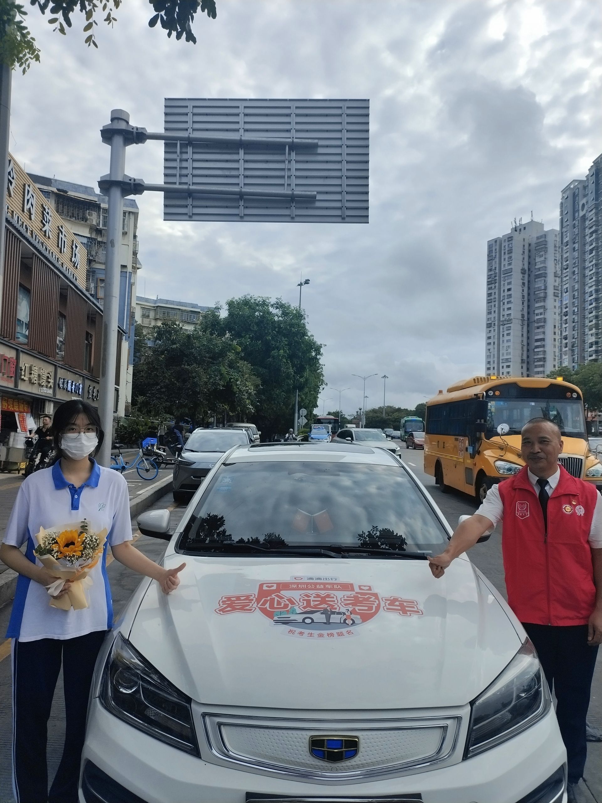 每年6月,黃天華會主動參加“愛心送考車隊”,他在引擎蓋上貼上“深圳公益車隊愛心送考車 祝考生金榜題名”的標(biāo)志,換上紅馬甲,在高考三天期間基本上不對外接單,把所有的時間都用來接送有需要的高考學(xué)子。