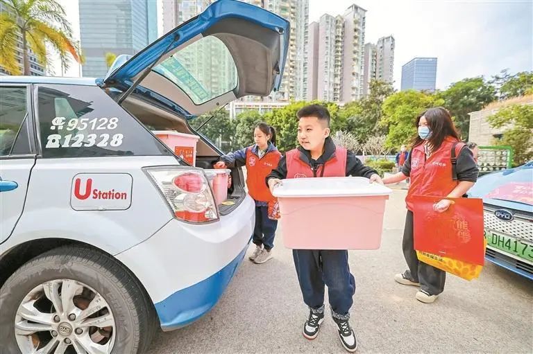 ▲“愛心年夜飯”大禮包抵達鹽田區行政文化中心廣場。 深圳晚報記者 李嫻 攝