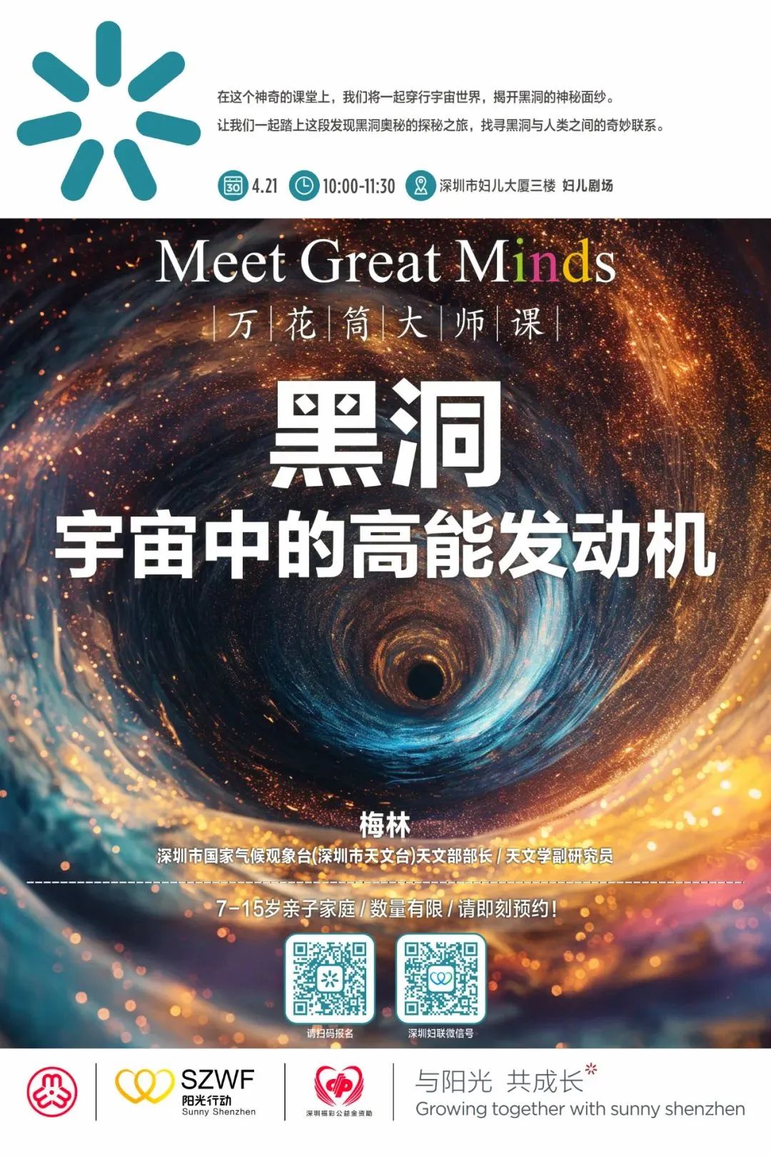 活動簡介:黑洞是什么?黑洞是如何形成的?本期萬花筒大師課,我們將一起穿行宇宙世界,探索黑洞奧秘,找尋黑洞與人類的奇妙聯(lián)系,揭開黑洞的神秘面紗。