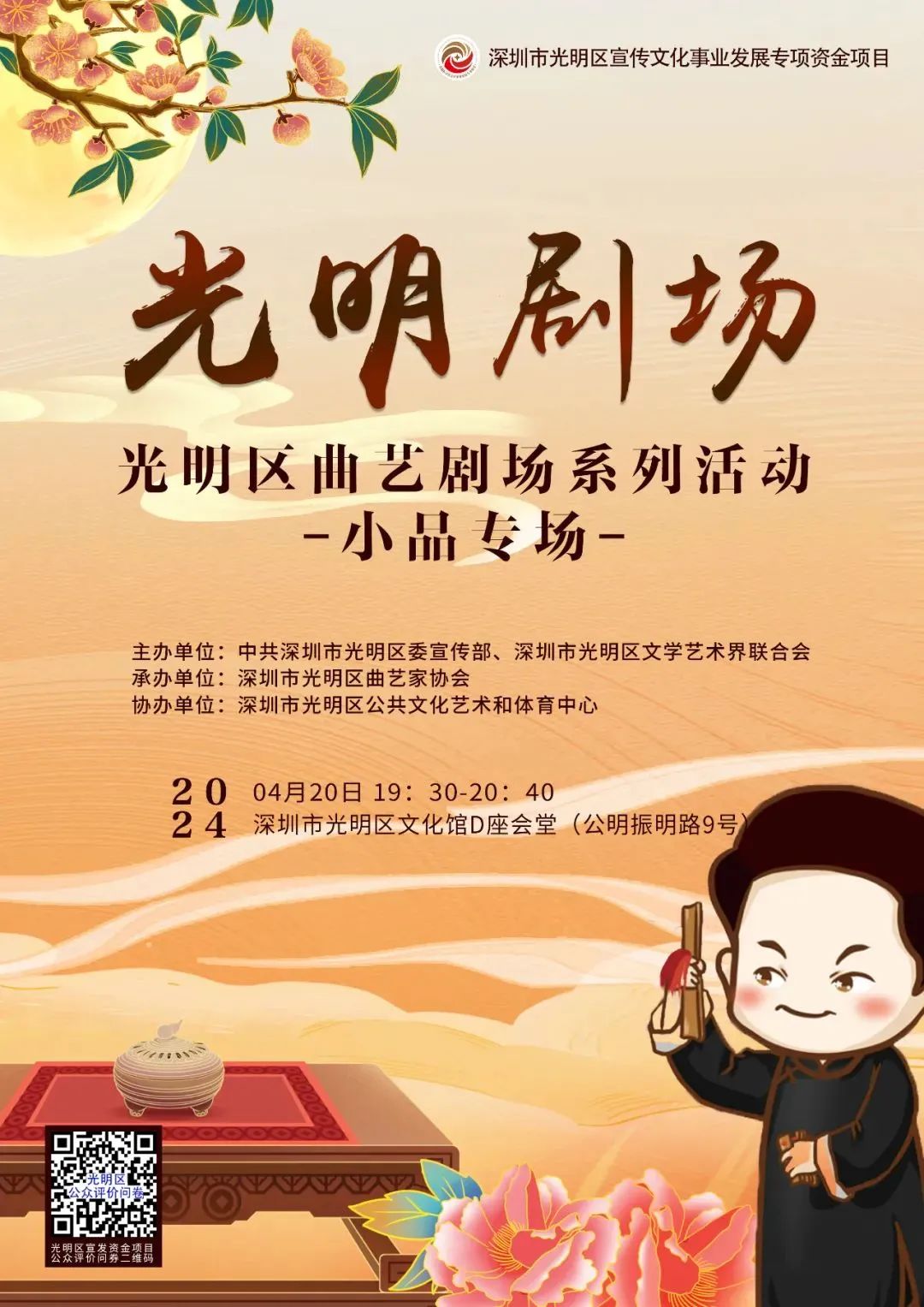 活動簡介:光明劇場——光明區(qū)曲藝劇場系列活動將于4月20日晚7:30在光明區(qū)文化館D座會堂精彩上演!在家門口觀賞曲藝盛宴的機會來了!搶票gogogo!本次活動由光明區(qū)宣傳文化事業(yè)發(fā)展專項資金資助,中共深圳市光明區(qū)委宣傳部、深圳市光明區(qū)文學藝術界聯(lián)合會主辦,深圳市光明區(qū)曲藝家協(xié)會承辦。