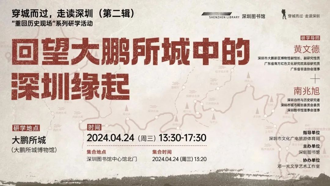 活動簡介:在4月23日“世界讀書日”及公共圖書館服務宣傳周期間,深圳圖書館將舉辦“穿城而過,走讀深圳”第二輯“重回歷史現(xiàn)場”系列研學活動。本次研學以深圳海防為行走主線,帶領市民讀者走進百年古城,觸摸大鵬所城人文景觀,回望深圳抵御外侮抗戰(zhàn)歷史。