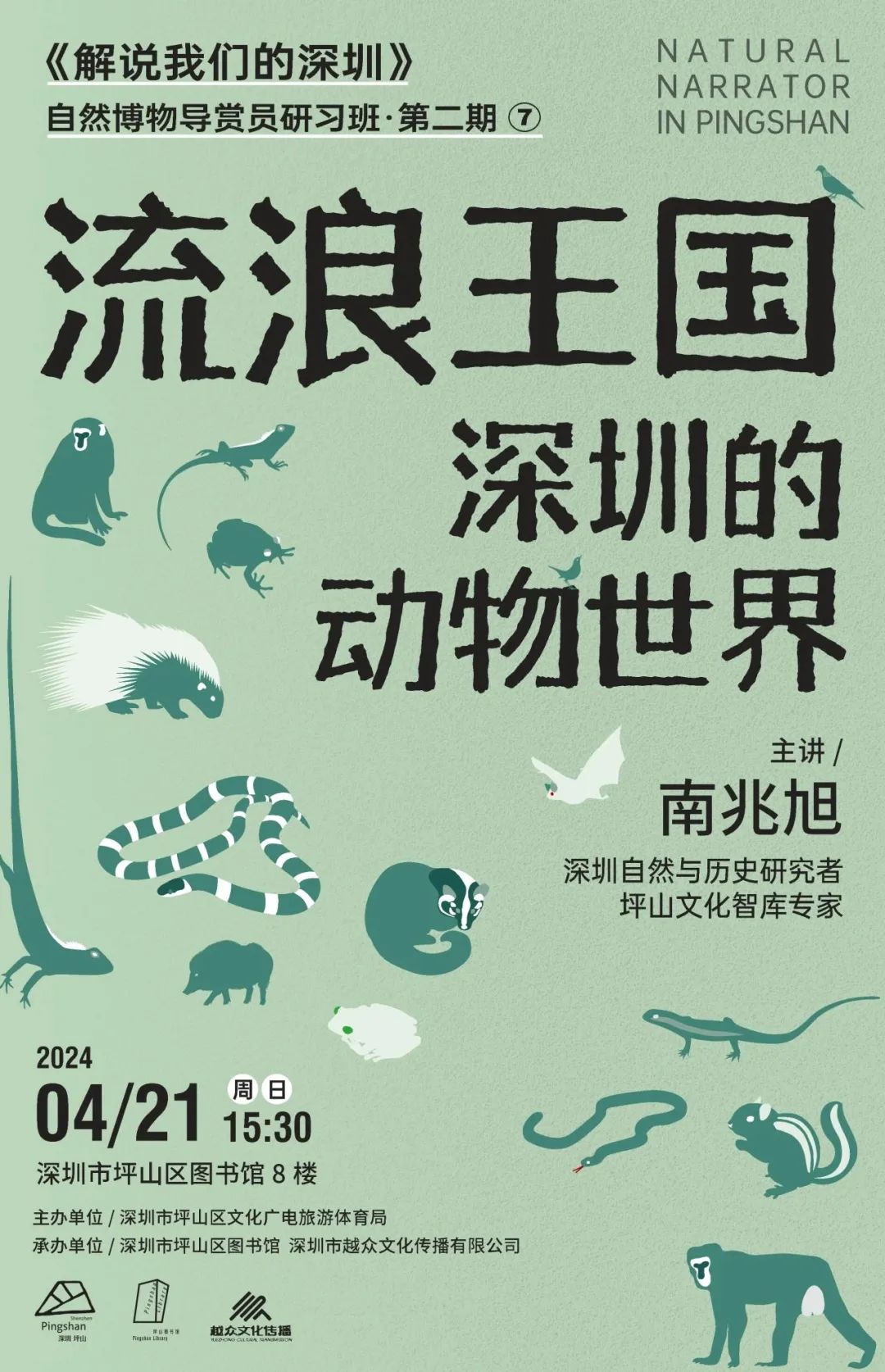活動簡介:山海連城的深圳,有山嶺和密林,有海洋和濕地,有河流與湖泊,它們中間隱居著各種各樣的生命。深圳有2萬多種動物,它們如何在都市的周邊生存?它們有哪些神奇的故事?本周日下午,聽南兆旭老師介紹那些低調而隱秘的“另類居民”,講述它們的喜怒哀樂、生老病死以及與我們深圳人的萬千關聯(lián)。讓我們一起探索深圳的動物世界,發(fā)現(xiàn)超級都市里的隱秘王國。