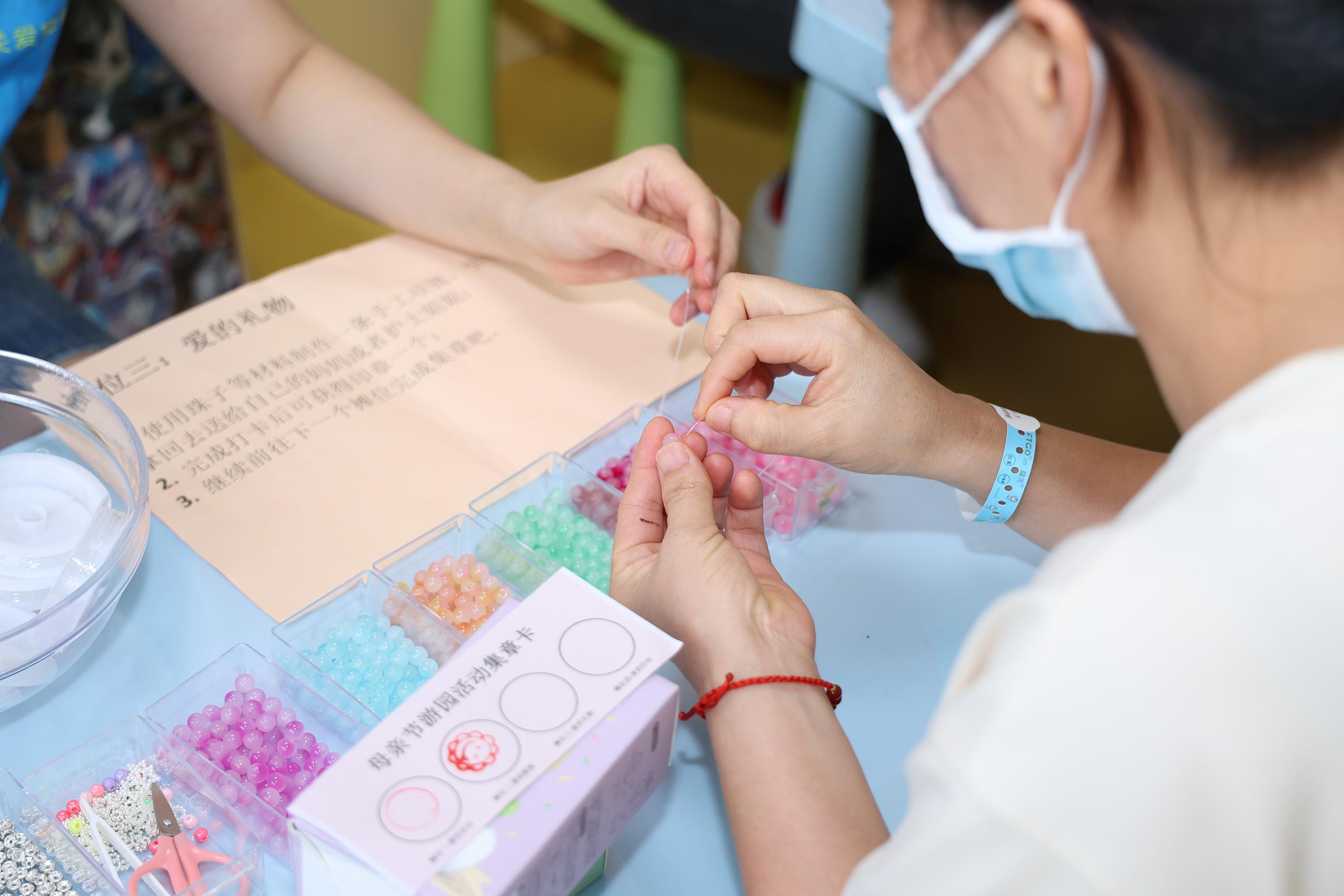 活動現場,孩子們在關愛空間社工的指導下,親手制作了蝶古巴特麻布袋、玫瑰花瓶、小紅花、女王花帽等手工藝品,并精心挑選了寶藏盒串手鏈作為節日禮物,送給自己的母親。這些禮物不僅代表了孩子們對母親深深的感激之情,也展現了他們獨特的創意和用心。此外,孩子們還借助透明相框描繪母親的樣貌,親手為母親制作了一幅畫像,用相機抓拍與母親在一起的美好瞬間,讓這份愛永遠定格。