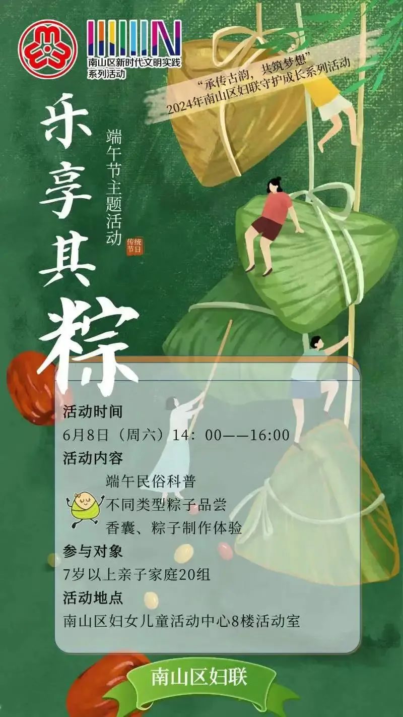活動簡介:端午節將至,為了讓更多的家庭感受傳統文化的魅力,南山區婦聯特別推出了一場充滿濃郁節日氛圍的端午節主題活動,誠摯邀請市民和家人一同參與,在這個特別的日子里樂享其“粽”,共度美好時光!讓我們一起承傳古韻,共筑夢想!
