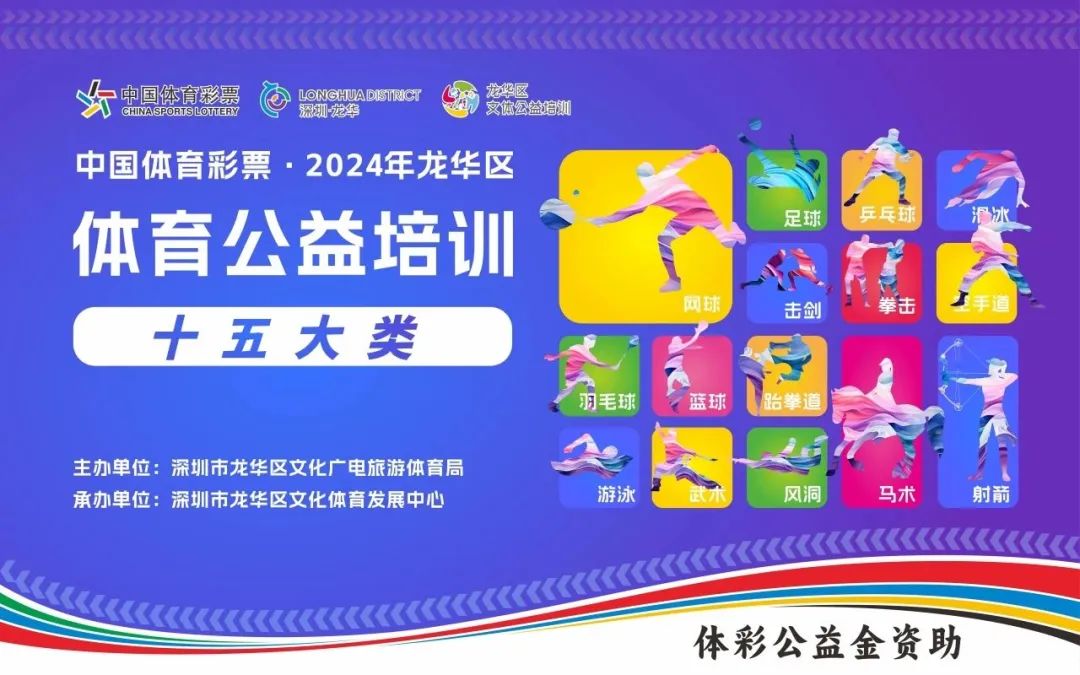 活動簡介:2024年龍華區體育公益培訓在4月至11月開展,共有15項體育類項目,不僅有傳統項目:籃球、網球、乒乓球、羽毛球、足球、游泳,也有平常少接觸的特色項目:馬術、擊劍、射箭、拳擊、武術、風洞、滑冰、空手道、跆拳道。