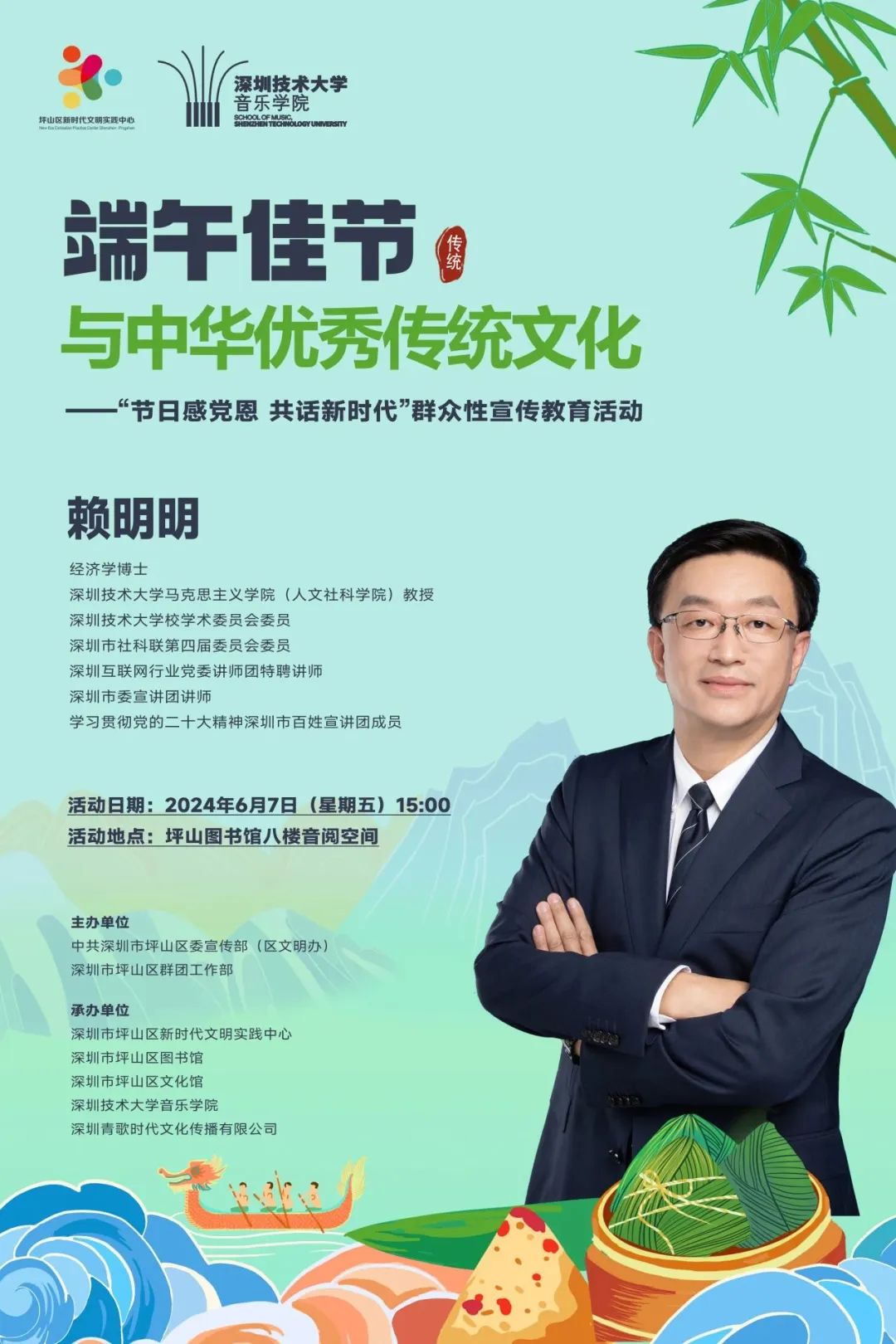 活動簡介:中共深圳市坪山區委宣傳部(區文明辦)聯合深圳市坪山區圖書館等單位,于2024年6月7日(星期五)15:00在坪山區圖書館舉辦“端午節與中華優秀傳統文化”——坪山區“節日感黨恩 共話新時代”群眾性宣傳教育活動。本次活動將邀請經濟學博士深圳技術大學馬克思主義學院教授賴明明深入講解端午節的起源、習俗及其背后的中華優秀傳統文化。同時,現場還有屈原詩畫表演、原創中國舞、歌唱等精彩節目。