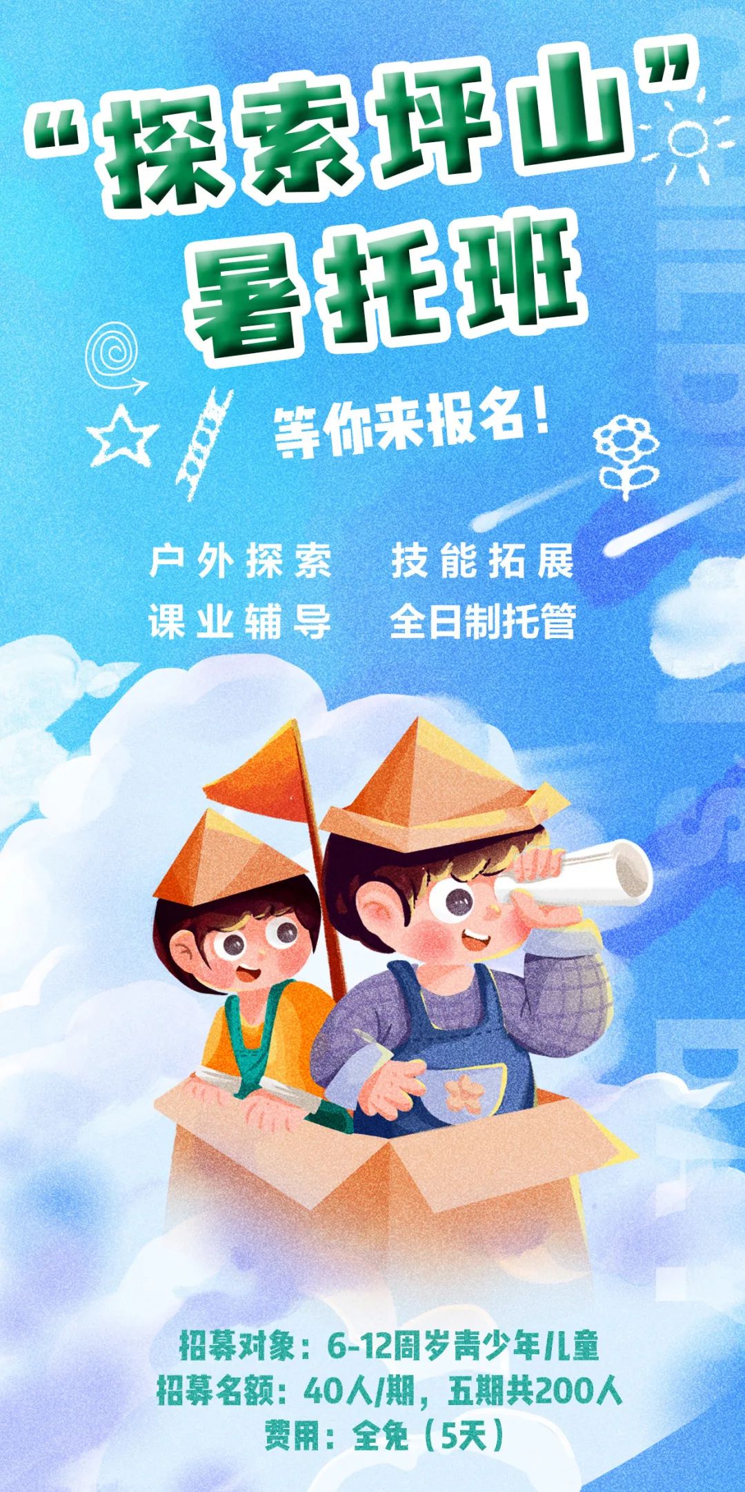 活動(dòng)簡(jiǎn)介:坪山區(qū)群團(tuán)工作部、區(qū)教育局聯(lián)合區(qū)工業(yè)和信息化局、區(qū)文化廣電旅游體育局、區(qū)城市管理和綜合執(zhí)法局開(kāi)展“探索坪山”暑托班,帶領(lǐng)小朋友了解坪山、愛(ài)上坪山,度過(guò)一個(gè)安全、豐富且意義非凡的假期。五大主題,多種課程,漫步坪山,寓學(xué)于樂(lè),讓小朋友的暑期日記不再?zèng)]有話題!