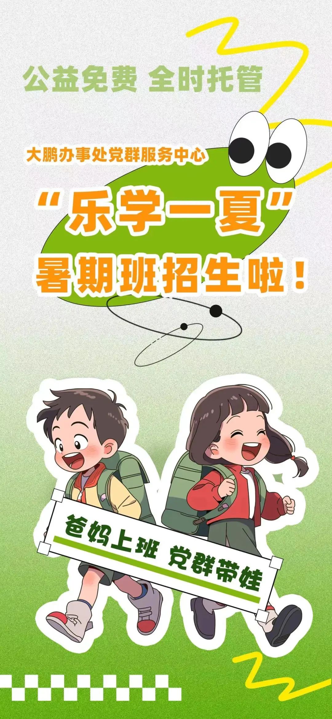 活動(dòng)簡(jiǎn)介:暑假來(lái)了,孩子看護(hù)成難題?暑期作業(yè)輔導(dǎo)成煩惱?如何為孩子開(kāi)啟一段歡快的暑期之旅?別擔(dān)心,大鵬辦事處黨群服務(wù)中心備好了解憂良策。面向大鵬辦事處轄區(qū)1-6年級(jí)(7-12周歲)學(xué)齡期兒童青少年開(kāi)設(shè)兩期全時(shí)托管班。尤克里里、陶笛、書(shū)法、手抄報(bào)、科技創(chuàng)意實(shí)踐、二十四節(jié)氣非遺手工、紅色電影、趣味課堂、作業(yè)輔導(dǎo)……在這里,孩子們將體驗(yàn)多元化智趣課堂活動(dòng),練就“十八般武藝”,德智體美勞全面綻放。